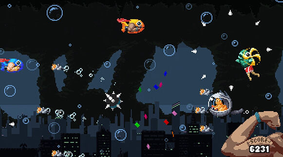 Shütshimi is a randomized shoot’em up about a muscle-bound fish with memory problems defending the seven seas. Defeat or navigate through waves of enemies, collecting new upgrades every 10 seconds that change up the gameplay as you battle your way through each of the game’s bosses.